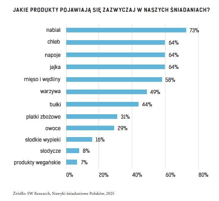 Jeszcze istotniejsze jest to, co faktycznie znajduje się na śniadaniowych talerzach. Najczęściej pojawia się nabiał (73 proc.), stanowiąc jeden z kluczowych elementów branży piekarniczej i cukierniczej.