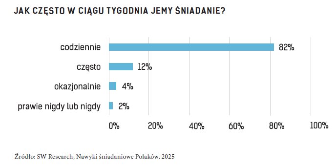 Podstawowym mechanizmem napędzającym ten rynek jest regularność konsumpcji, szczególnie widoczna w przypadku śniadań. Dane SW Research "Nawyki śniadaniowe Polaków 2025" pokazują, że 82 proc. Polaków je śniadanie codziennie, 12 proc. robi to często, 4 proc. okazjonalnie, a jedynie 2 proc. prawie nigdy lub nigdy. W praktyce oznacza to, że zdecydowana większość konsumentów każdego dnia podejmuje poranną decyzję żywieniową. Z perspektywy gastronomii jest to sytuacja unikalna - niewiele kategorii menu daje tak przewidywalny i powtarzalny ruch przez pięć-sześć dni w tygodniu.