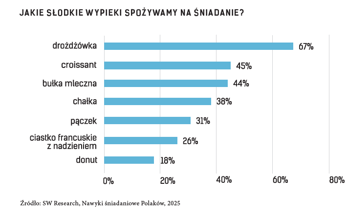 Jak wynika z badań SW Research, typowe polskie śniadanie uzupełniają drożdżówki (67 proc.), następnie croissanty (45 proc.), bułki mleczne (44 proc.), chałki (38 proc.), pączki (31 proc.), ciastka francuskie z nadzieniem (26 proc.) oraz donuty (18 proc.). Są to produkty głęboko zakorzenione w codzienności, rozpoznawalne i lubiane przez szerokie grono konsumentów, co czyni je idealną bazą sprzedażową dla gastronomii.